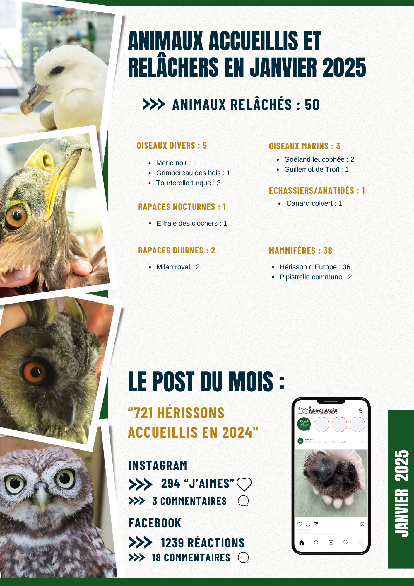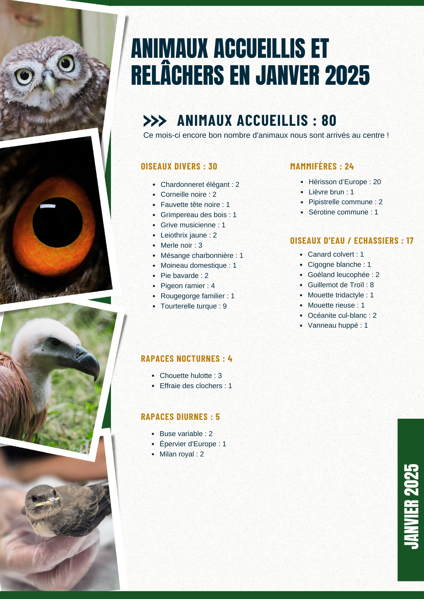 Animaux accueillis et relâchés en janvier 2025