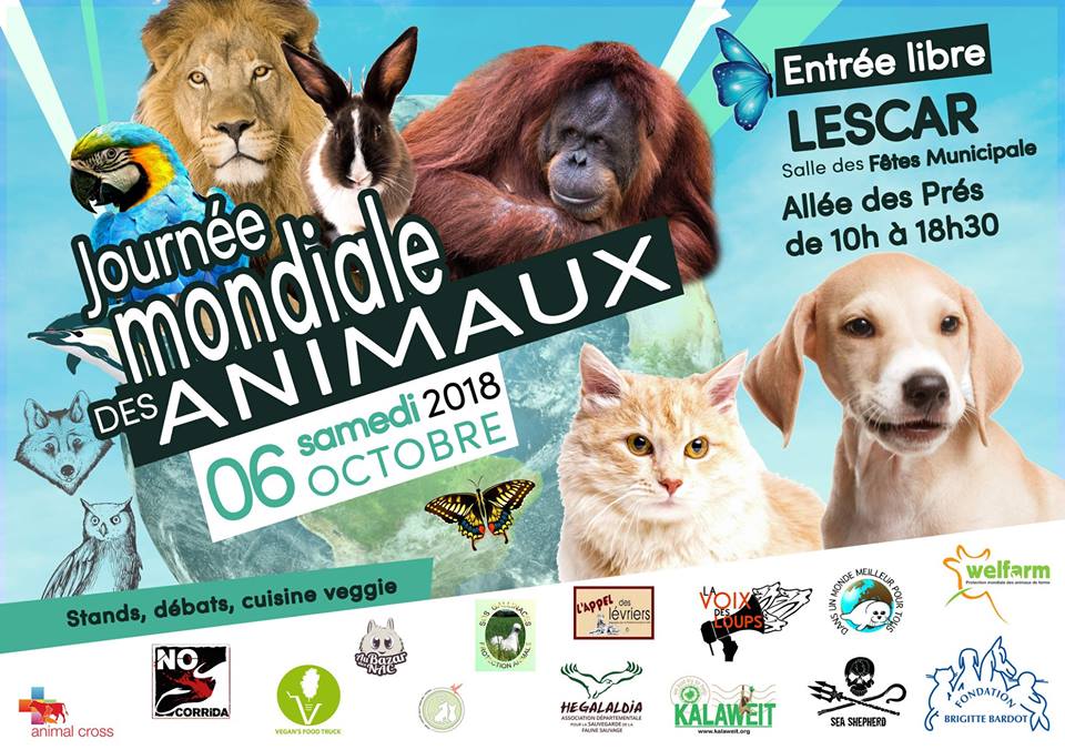 Samedi 06 octobre, nous serons présents à Lescar pour la journée mondiale des animaux. Si vous souhaitez y participer, rendez-vous à la salle des fêtes de Lescar (allée des Prés), à partir de 10h30 jusqu’à 18h.
