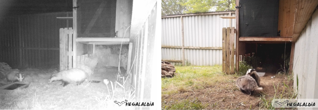 Nos trois blaireaux ont donc la chance de profiter d’un enclos de réhabilitation où ils peuvent jouer et s’émanciper sans contact avec l’homme. Comme le montrent les photos du « piège photo » que nous avons installé dans ce dernier. Vous y verrez les deux petits jouer à longueur de journée, tandis que l’adulte elle, préfère dormir tranquillement et n’explore son espace que durant la nuit.