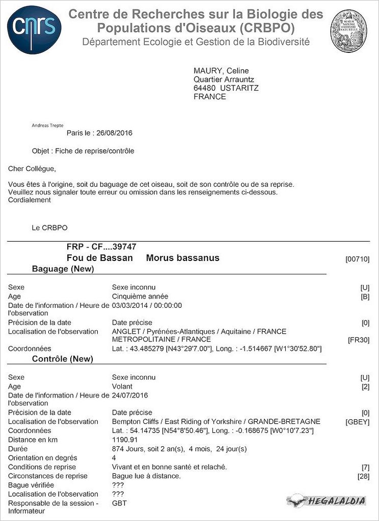 Les fous de Bassan sont des habitués à HEGALALDIA et c‘est avec un grand plaisir que nous apprenions que la bague qu’il portait lors de cette observation lui a été offerte à sa sortie de notre centre de soins ! Et le plus gratifiant a été d’apprendre que cette observation fut faite en grande Bretagne, non loin d’une des plus grandes colonies de reproduction européenne de fou de Bassan.