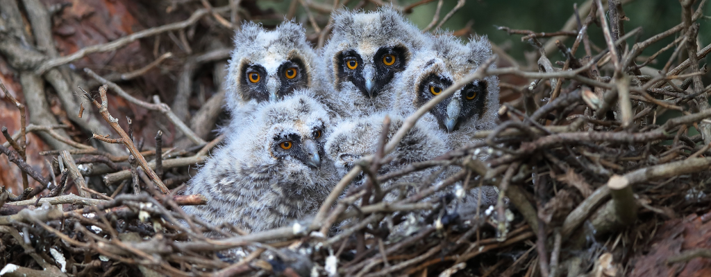 Nidification et petits : Les hiboux Grand-Ducs sont des nicheurs cavicoles comme le Petit-Duc Scops. Les couples se forment en Octobre et les nids commencent à être construits en Mars. La femelle pond 2 à 4 œufs blancs, puis elle couve durant 32 à 37 jours, les petits deviendront autonomes au bout de 20 à 24 semaines. Les poussins de Grand-Duc sont blancs et duveteux, arrivés au stade de juvéniles, leur plumage est semblable à l’adulte mais est plus clair et ils ne possèdent pas d’aigrettes. Les Petit-Duc ne préparent pas de nid et nichent durant les mois de Mai à Juillet pendant lesquelles la femelle pond 3 à 5 œufs. La couvaison dure 24 à 25 jours et les petits prennent leur premier envol au bout de 22 à 25 jours. Le juvénile de Petit-Duc Scops a un plumage moins marqué que l’adulte et ses yeux sont jaune-verts. Les Moyen-Ducs sont des nicheurs arboricoles, ils ne font pas de nid non plus mais utilisent des nids de corvidés abandonnés. La période de reproduction a lieu entre Mars et Avril, la femelle pond en moyenne 5 œufs et la couvaison durera 28 jours. Les juvéniles sont duveteux de couleur grise avec une face noire.