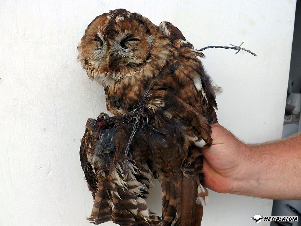 Les oiseaux pris au piège se débattent, provoquant généralement plusieurs fractures et déchirent tous les tissus. Souvenez-vous de la magnifique femelle grand-duc : toute la peau de son aile s’était arrachée… nous n’avions pas pu éviter la nécrose des tissus et nous avions était contraints de mettre fin à ses souffrances.