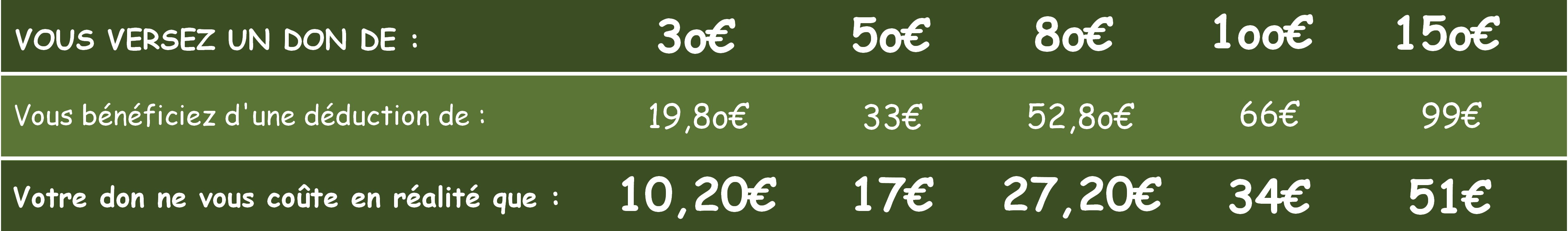 Vous désirez une déduction fiscale ? Chacun de vos dons est déductible de vos impôts ainsi pour un don Vous recevrez un reçu fiscal qui vous permettra de déduire de votre impôt 66 % du montant de votre don dans la limite de 20 % de votre revenu imposable.