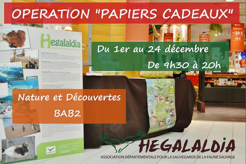 Nous vous rappelons donc que nous effectuons l’opération papiers cadeaux du 1er au 24 décembre, de 9h30 à 20h, devant le magasin Nature et Découvertes du BAB2. En partenariat avec ce dernier, nous réalisons gratuitement des papiers cadeaux pour les clients du magasin. Ceci est pour nous l’occasion de faire connaitre l’association ainsi que nos actions, et de récolter, nous l’espérons, quelques dons généreux.