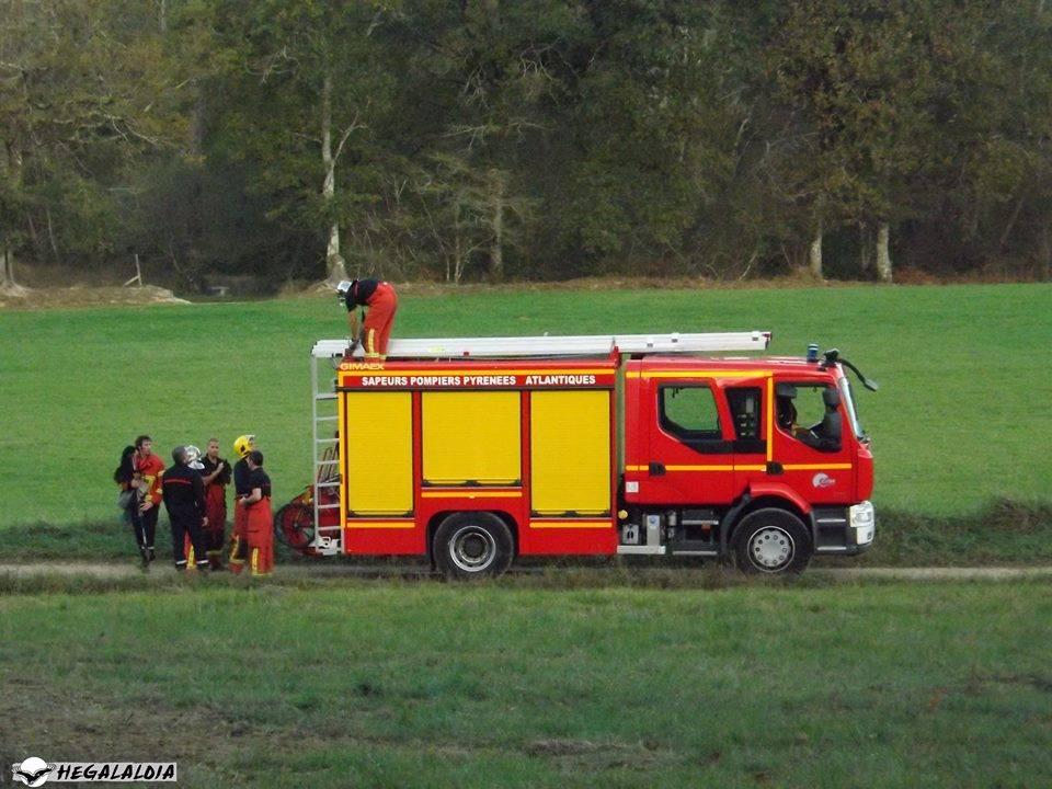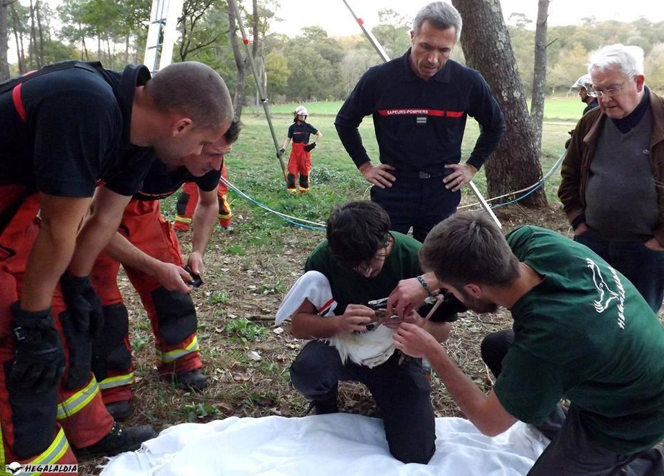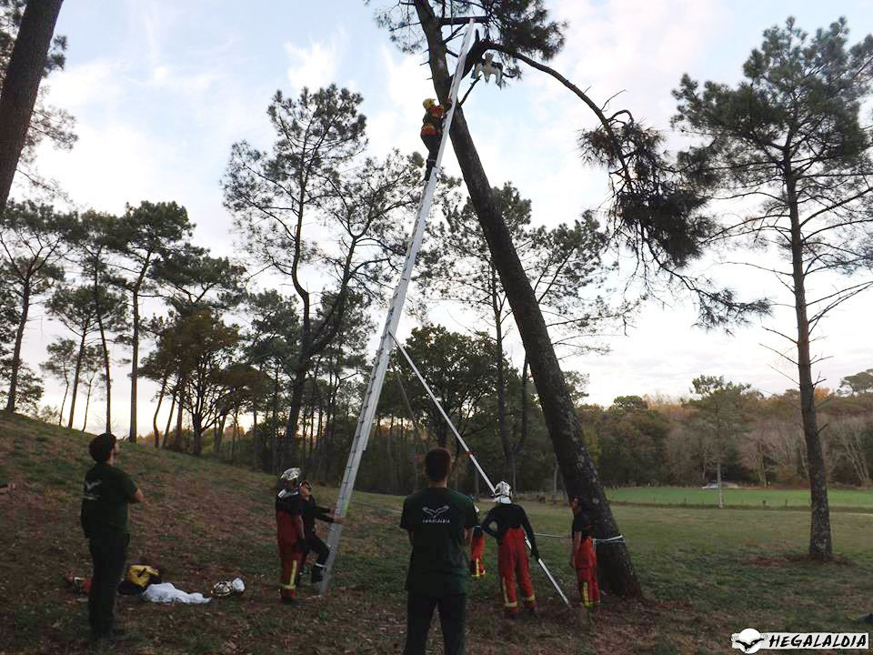 Arrivée de la grande échelle et des pompiers (ne soyez pas jalouses Mesdames !). Celui qui doit monter à l’échelle, nous le connaissons bien.. il est venu plusieurs fois se former à Hegalaldia. Nous sommes sereins. Nous lui donnons quelques conseils pour immobiliser l’animal, et c’est avec une grande dextérité qu’il a réussi à décrocher la cigogne !