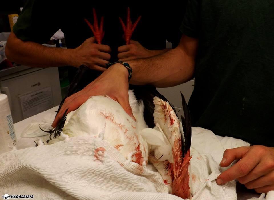 – Des blessures aux poignets de chaque aile sont très sanguinolentes. Elle s’est écorchée en se débattant. Deux points de suture sur chaque aile ont été nécessaires. L’aile droite présente un hématome important qui est inquiétant.