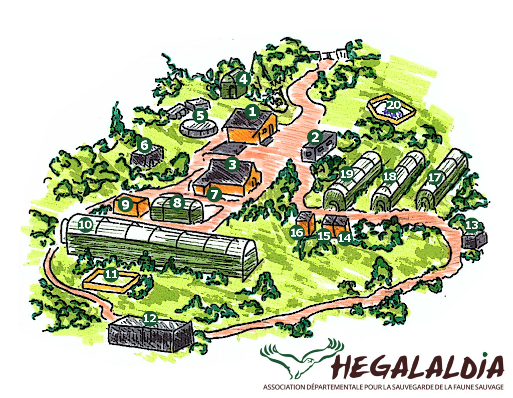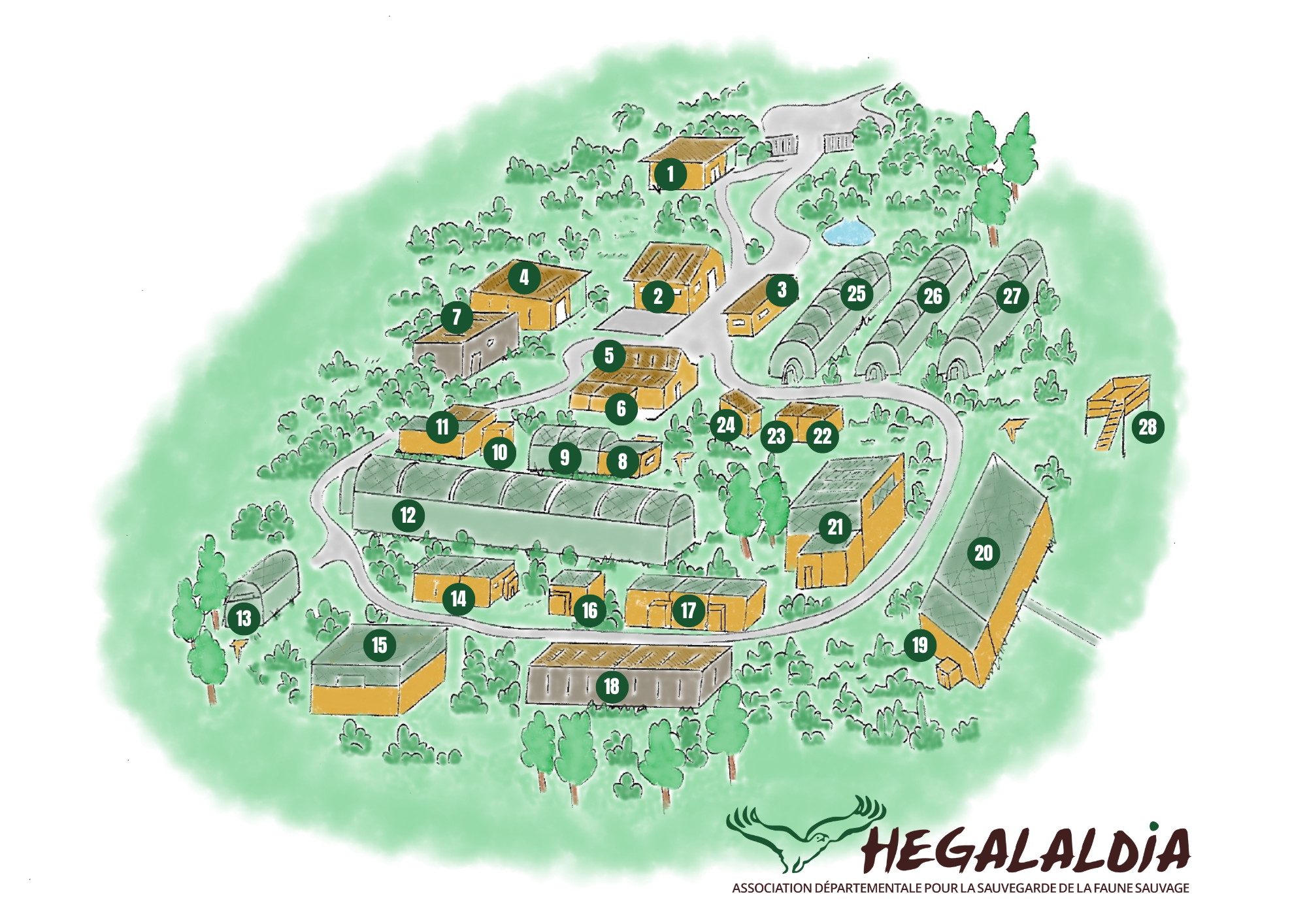 14- Volière « Percno 1 et 2 » 15- Volière « Gypa » 16-Volière à colombidés 17- Volières « Moun 1, 2 et 3 » 18-Volière en tôles 19- Volière mustélidés 20- Volière mammifères 21- Volières « Falco 1 et 2 » 22-Volière à passereaux 23-Volière polyvalente 24- Volière à turdidés 25-Volière de 26 m pour rapaces 26-Volière de 26 m pour rapaces 27-Volière de 26 m pour oiseaux d’eau 28- Plateforme de relâché |