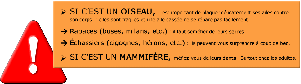 Au contraire, si un jeune animal court un danger immédiat (route, prédateur), que vous le voyez depuis longtemps sans ses parents, ou que vous voyez une blessure apparente : il faut le récupérer sans attendre.